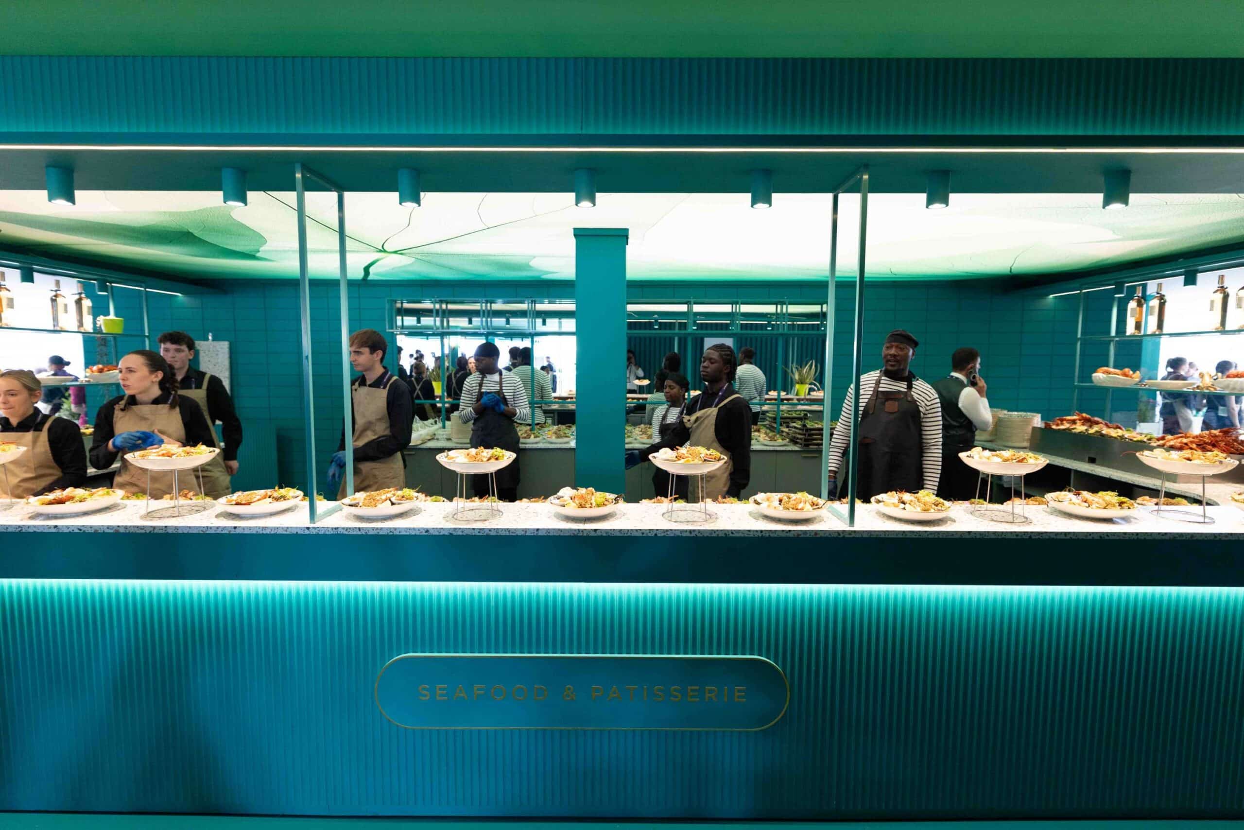 Located above The Lawn, it features unreserved seating areas designed for flexibility, with vibrant interiors, cantilever balconies overlooking the gardens, and stylish furnishings that create a lively atmosphere.